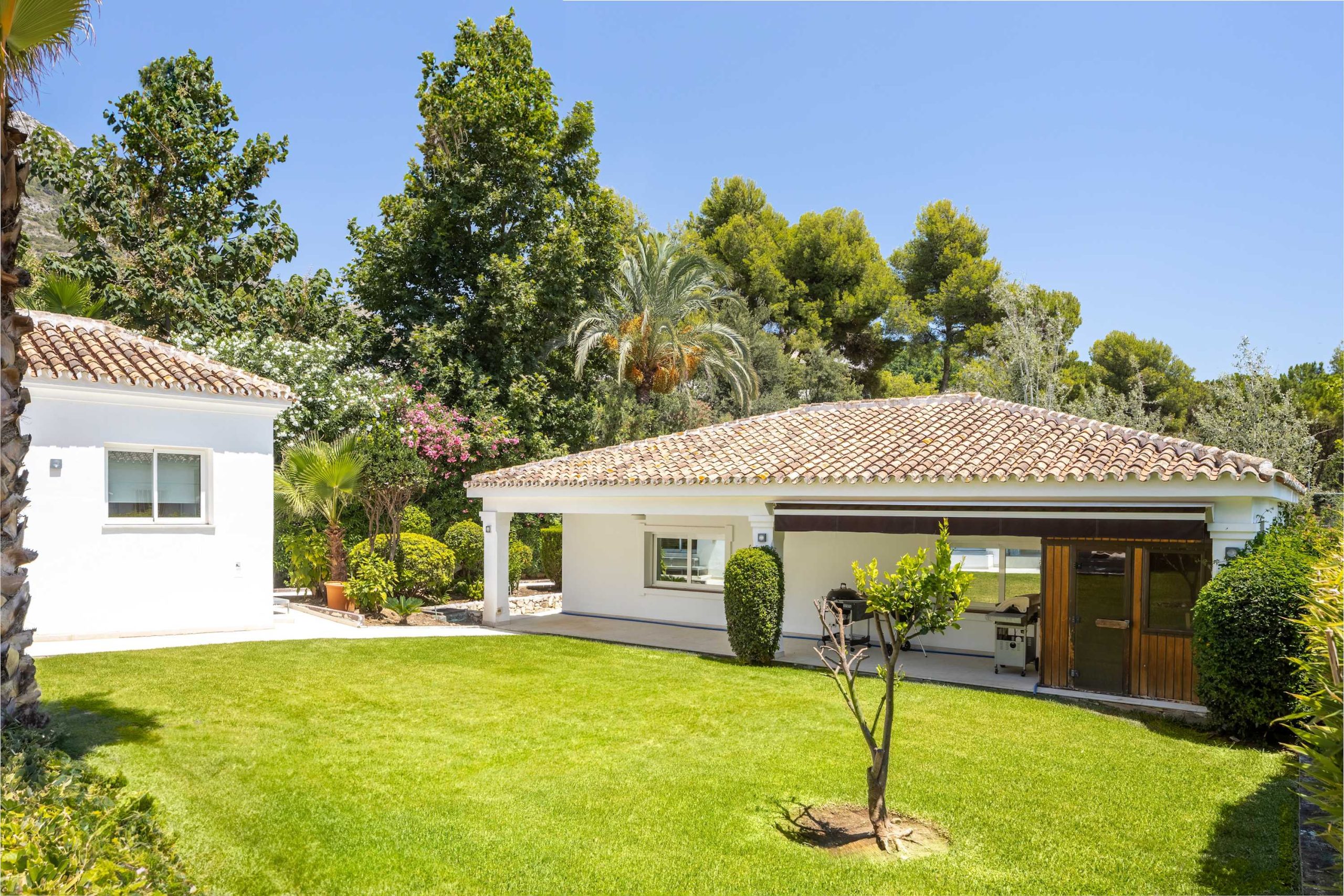 Experience pure luxury in this elegant villa, featuring underfloor heating throughout, a modern kitchen outfitted with premium Gaggenau appliances, and a lush, landscaped garden with a beautiful swimming pool. With four spacious bedrooms, including a serene master suite with its own terrace and stunning views, this property is designed for relaxation. An additional single bedroom and two double bedrooms all come with private bathrooms, offering comfort for every guest.