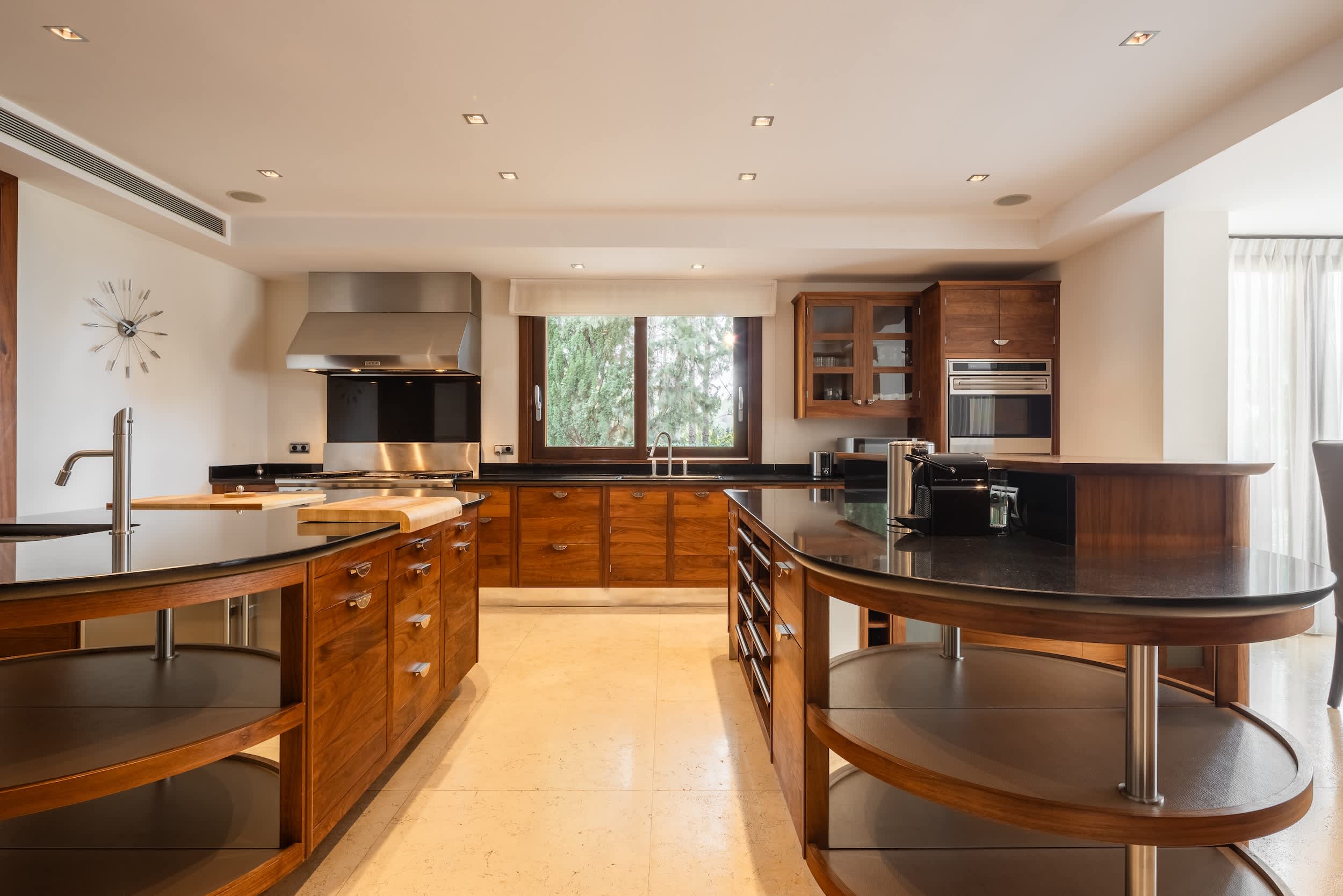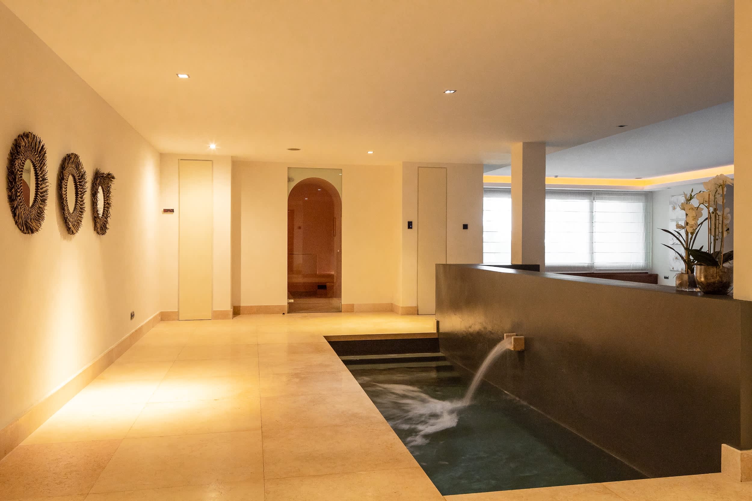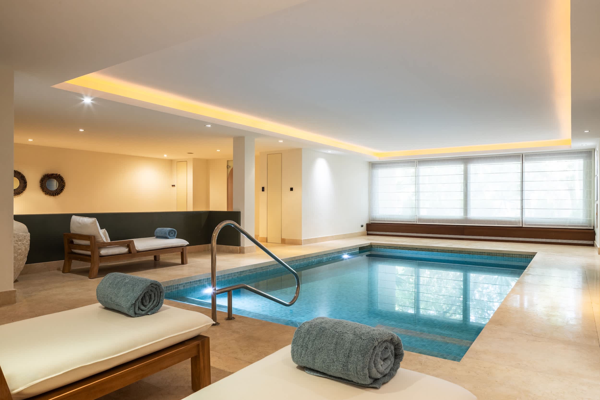 The villa’s amenities are truly world class. Indulge in the complete spa experience with a heated indoor pool, Turkish bath, sauna, and a massage room, all designed for ultimate relaxation. Climate control is seamless, with air conditioning and underfloor heating ensuring comfort in every corner, year-round. Security is prioritized, featuring a comprehensive alarm system with cameras covering the entire property, giving you peace of mind.