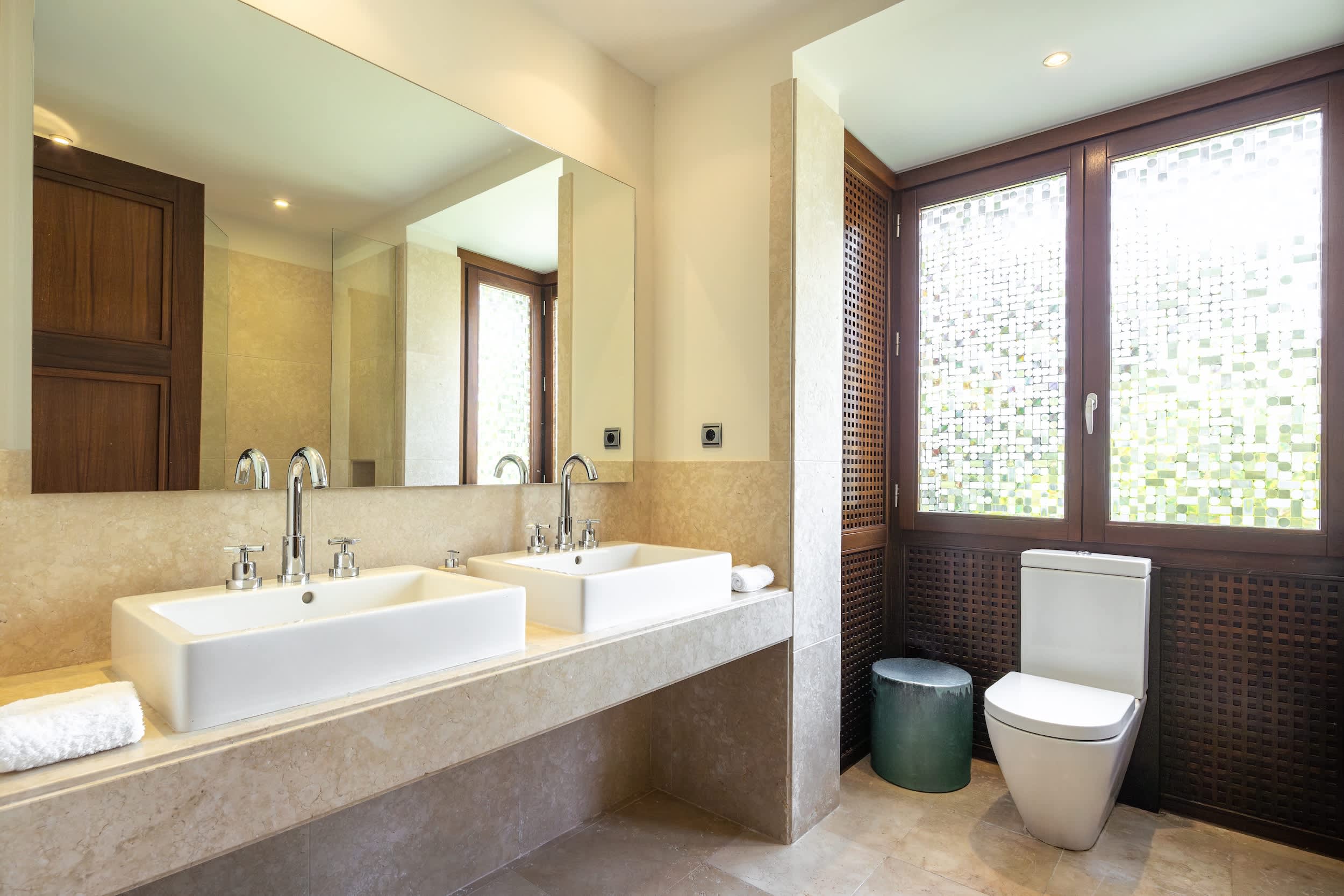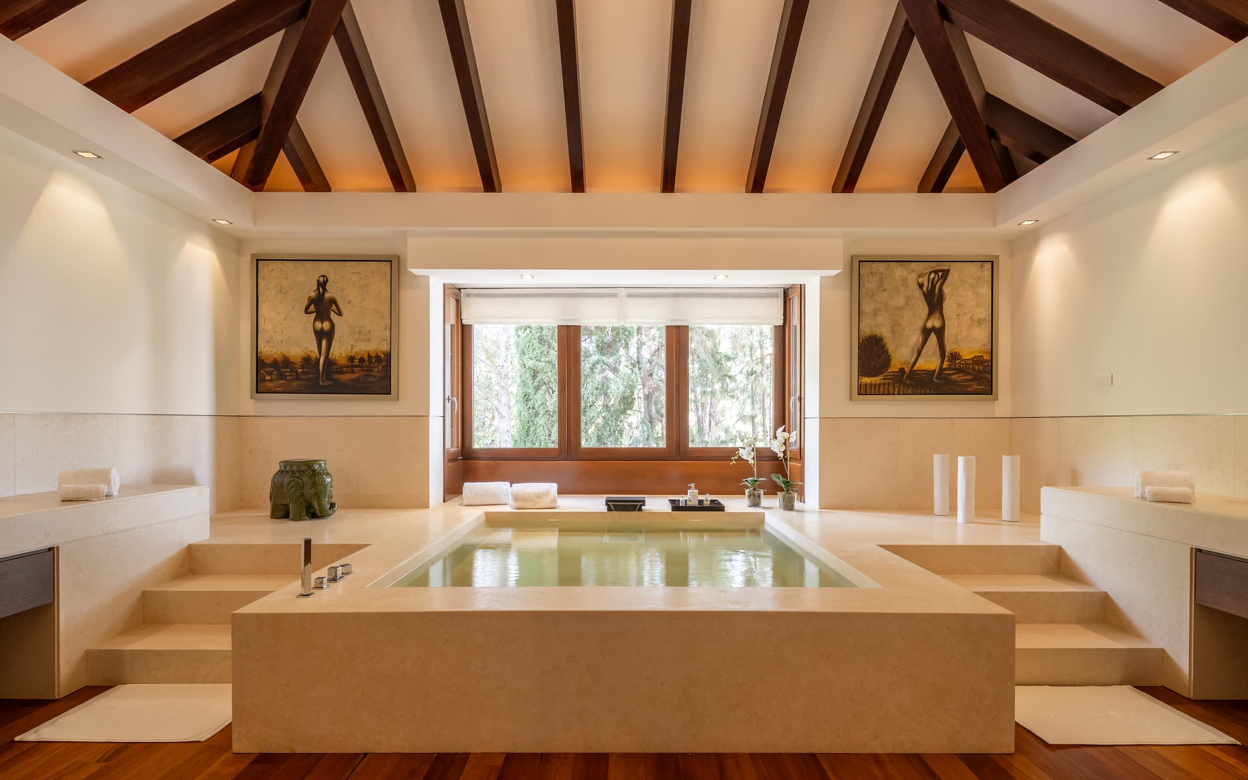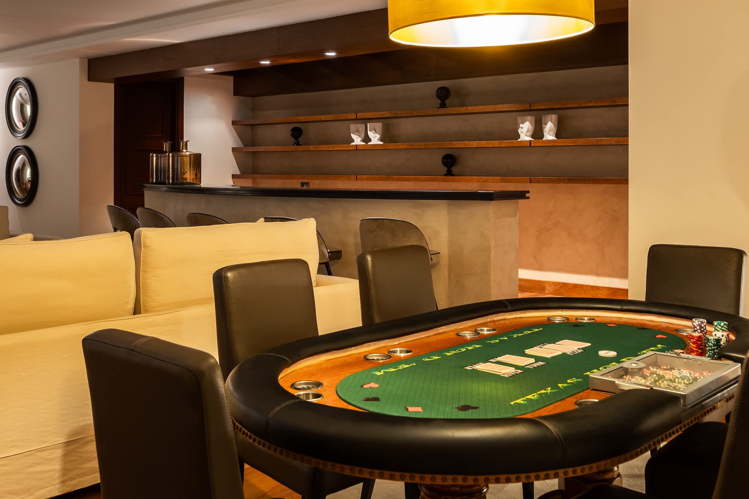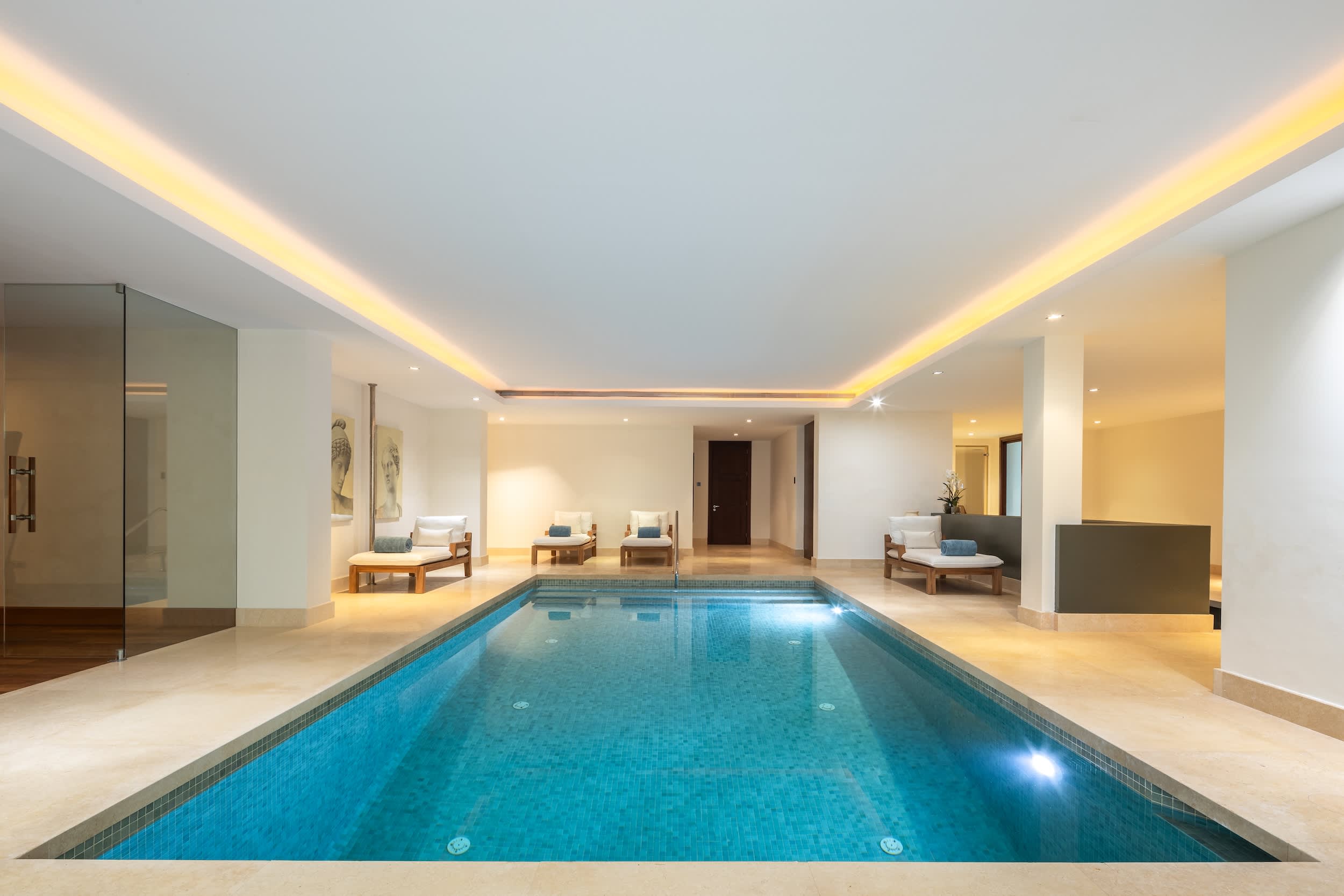 The villa’s amenities are truly world class. Indulge in the complete spa experience with a heated indoor pool, Turkish bath, sauna, and a massage room, all designed for ultimate relaxation. Climate control is seamless, with air conditioning and underfloor heating ensuring comfort in every corner, year-round. Security is prioritized, featuring a comprehensive alarm system with cameras covering the entire property, giving you peace of mind.
