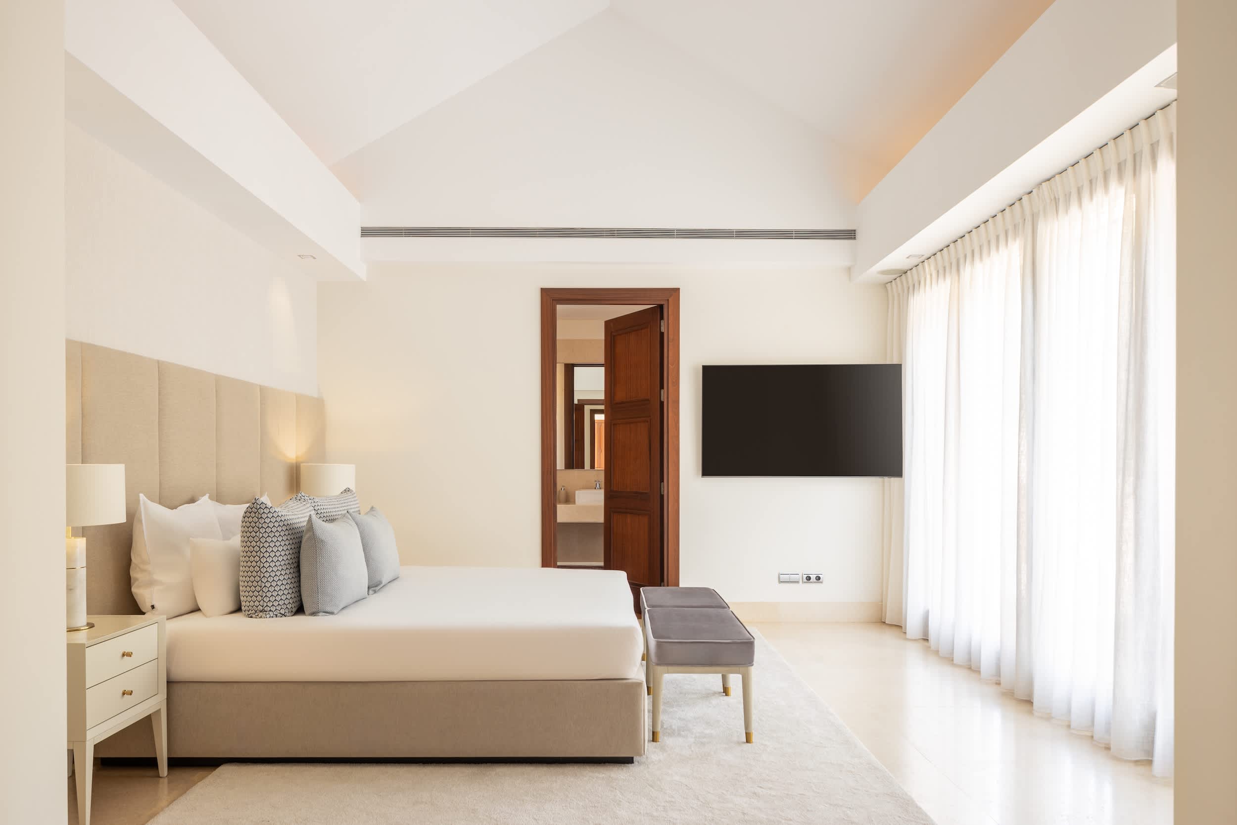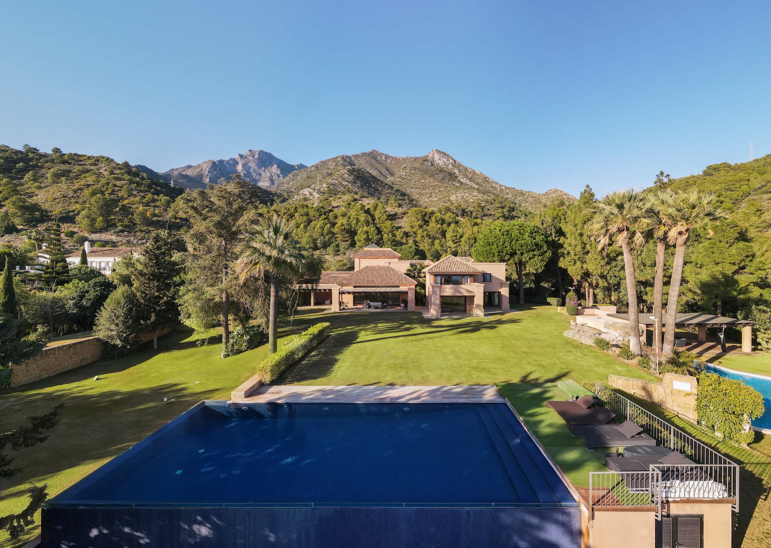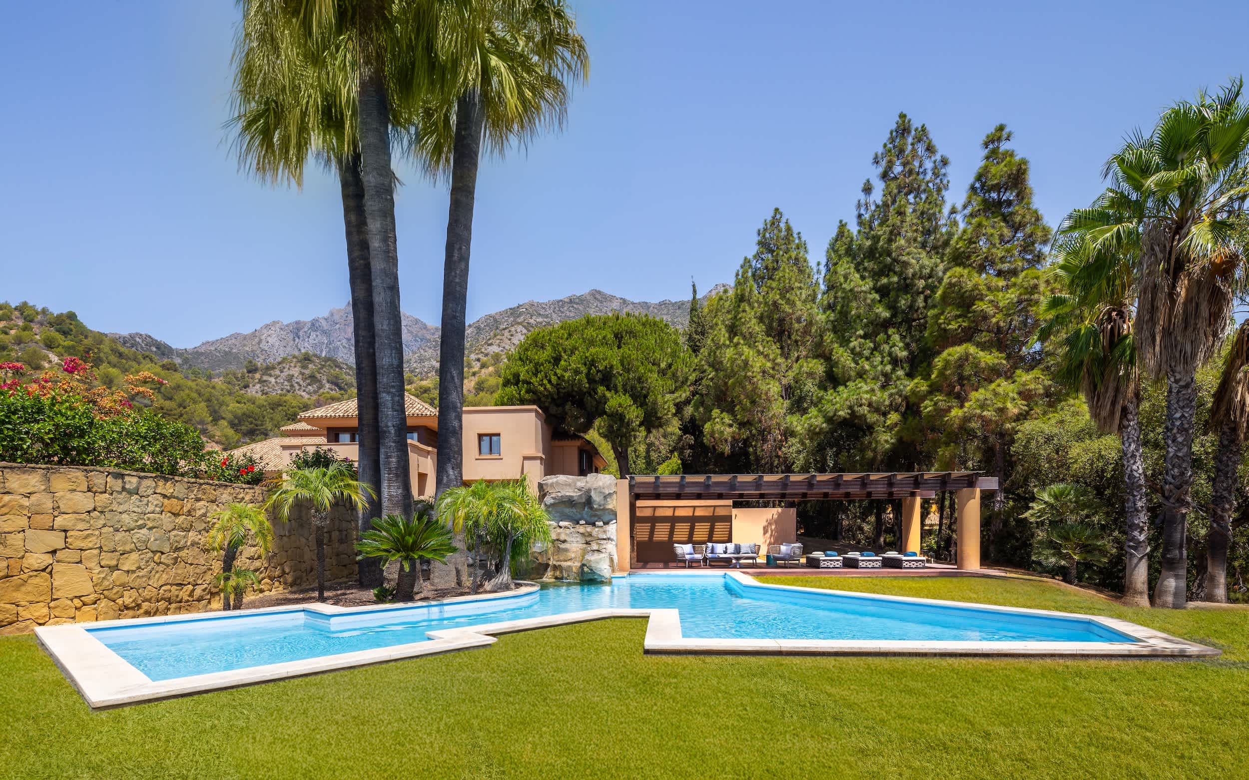 Welcome to this magnificent villa, where luxury greets you from the very entrance with grand marble fountains flanking each side, setting an impressive tone. Inside, the villa boasts five luxurious one bedroom suites and a fully equipped guest apartment, ensuring ample space and privacy. For entertainment, enjoy a private home cinema, a stylish bar and games room, and a fully outfitted gym.