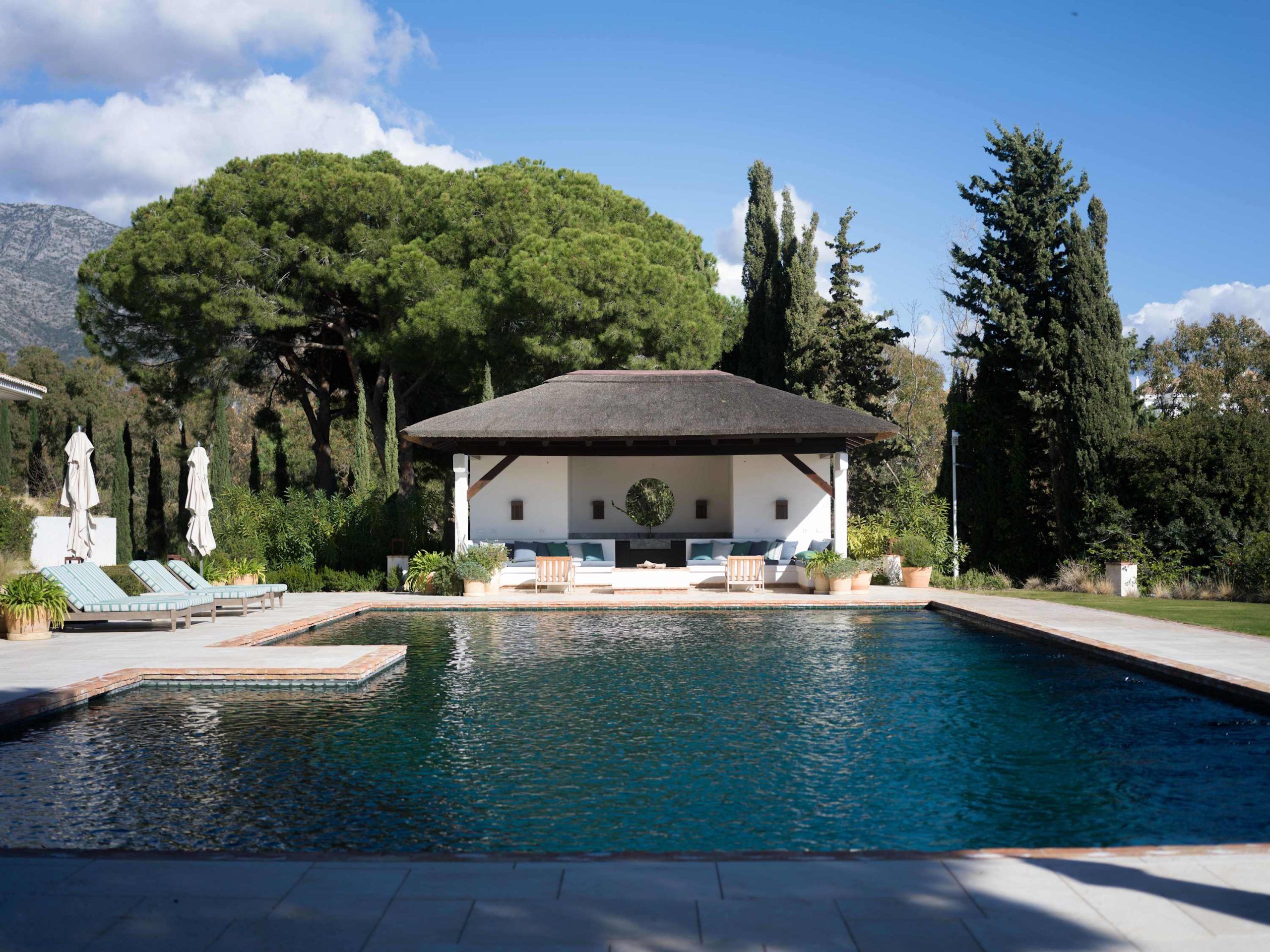 Outdoors, enjoy Andalusian architecture with expansive patios, lush gardens, and a large swimming, tennis court and ample spacing throughout the plot.