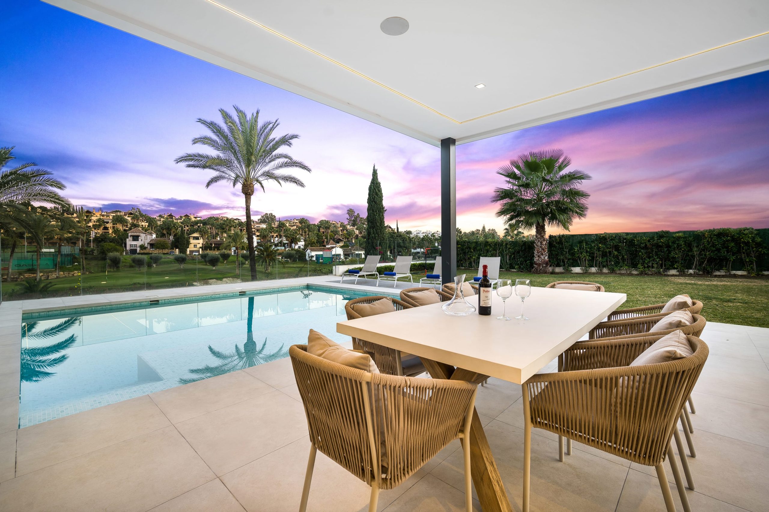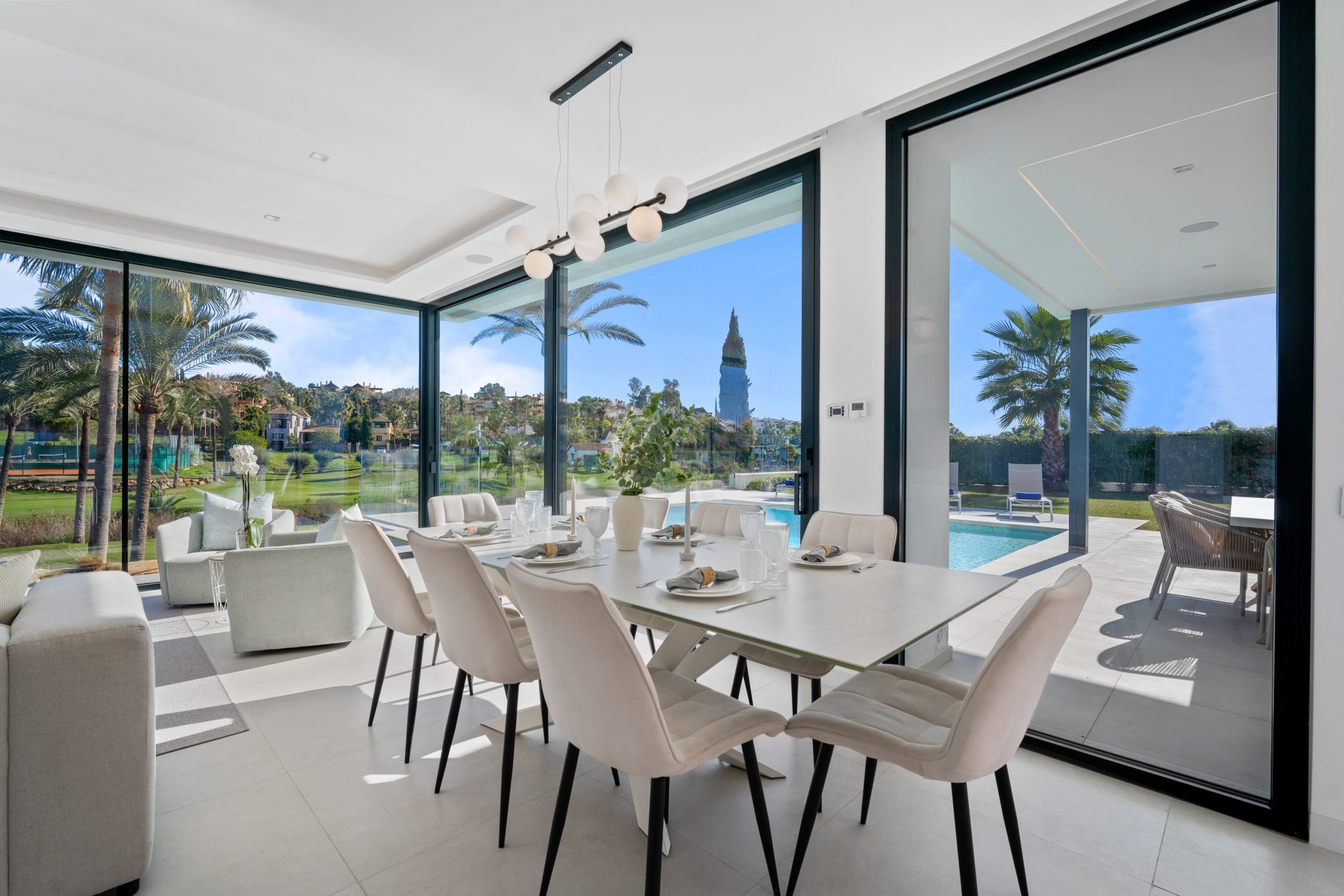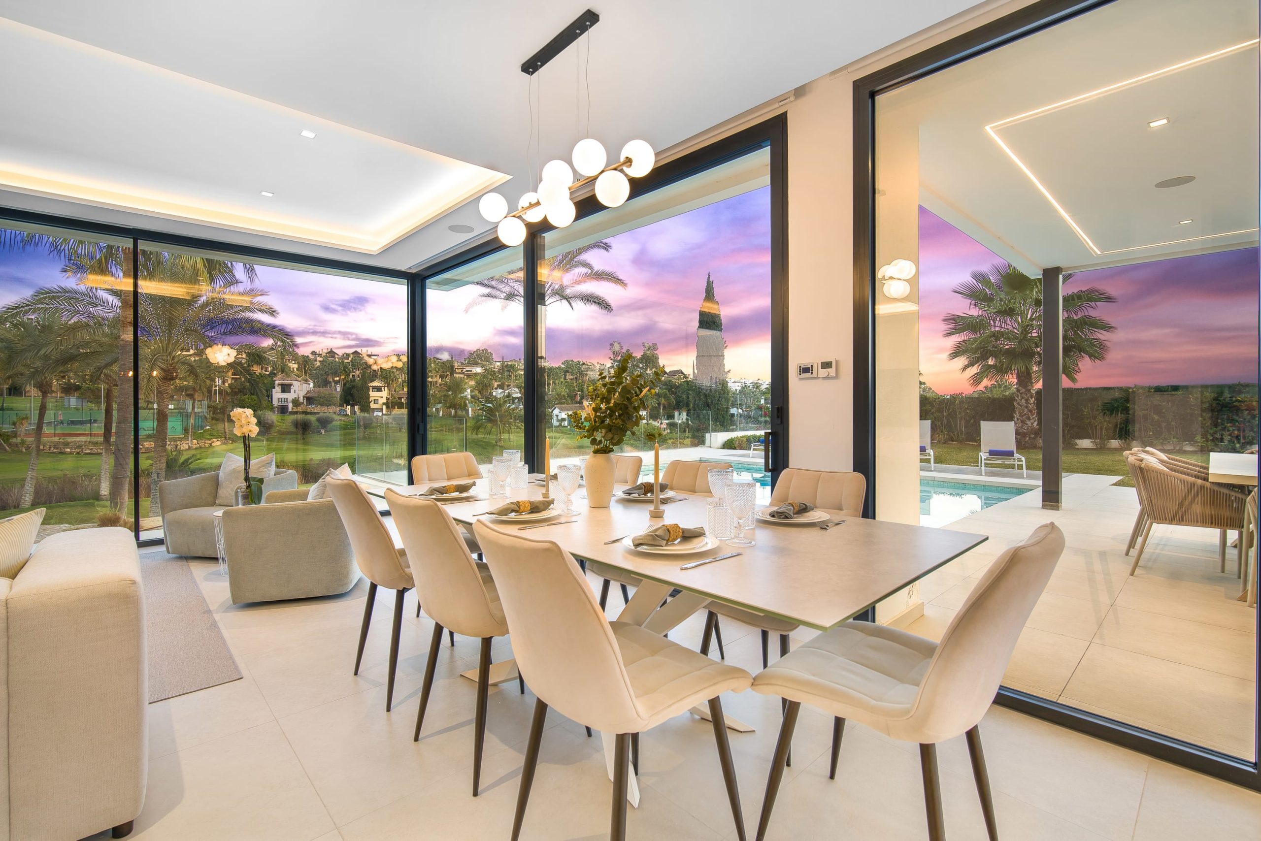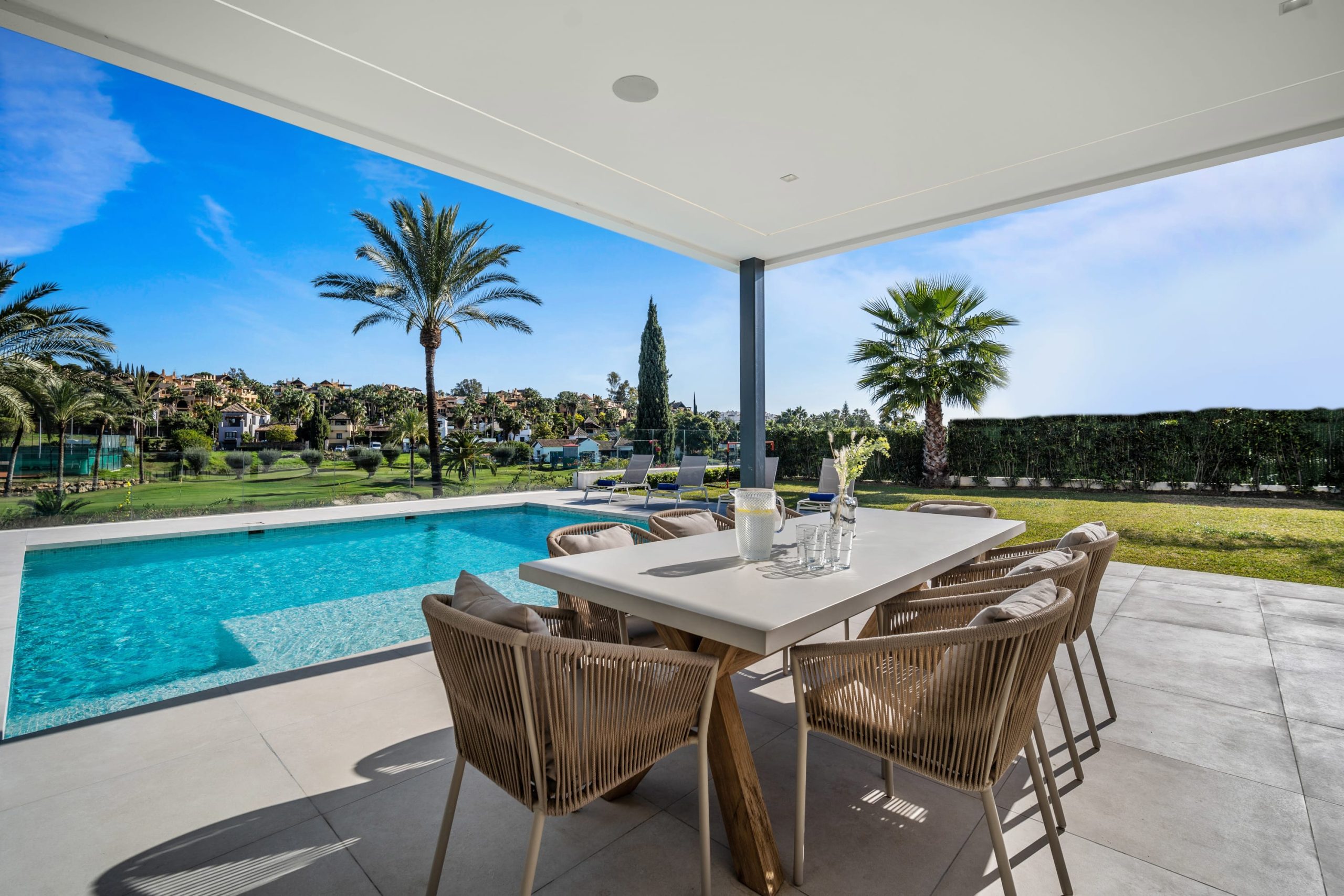 Villa Sandie is located in the tranquil setting in the heart of El Paraiso but only less than 3kms to the beach, this short-term rental is facing El Campanario Golf course and it has three other iconic golf courses: El Paraiso Golf, Atalaya Golf, and Guadalmina Golf, all within 8 minutes by car. The world famous marina of Puerto Banus is less than 10 minutes by car. The property is surrounded by the idyllic Andalusian nature and similar high-end properties.