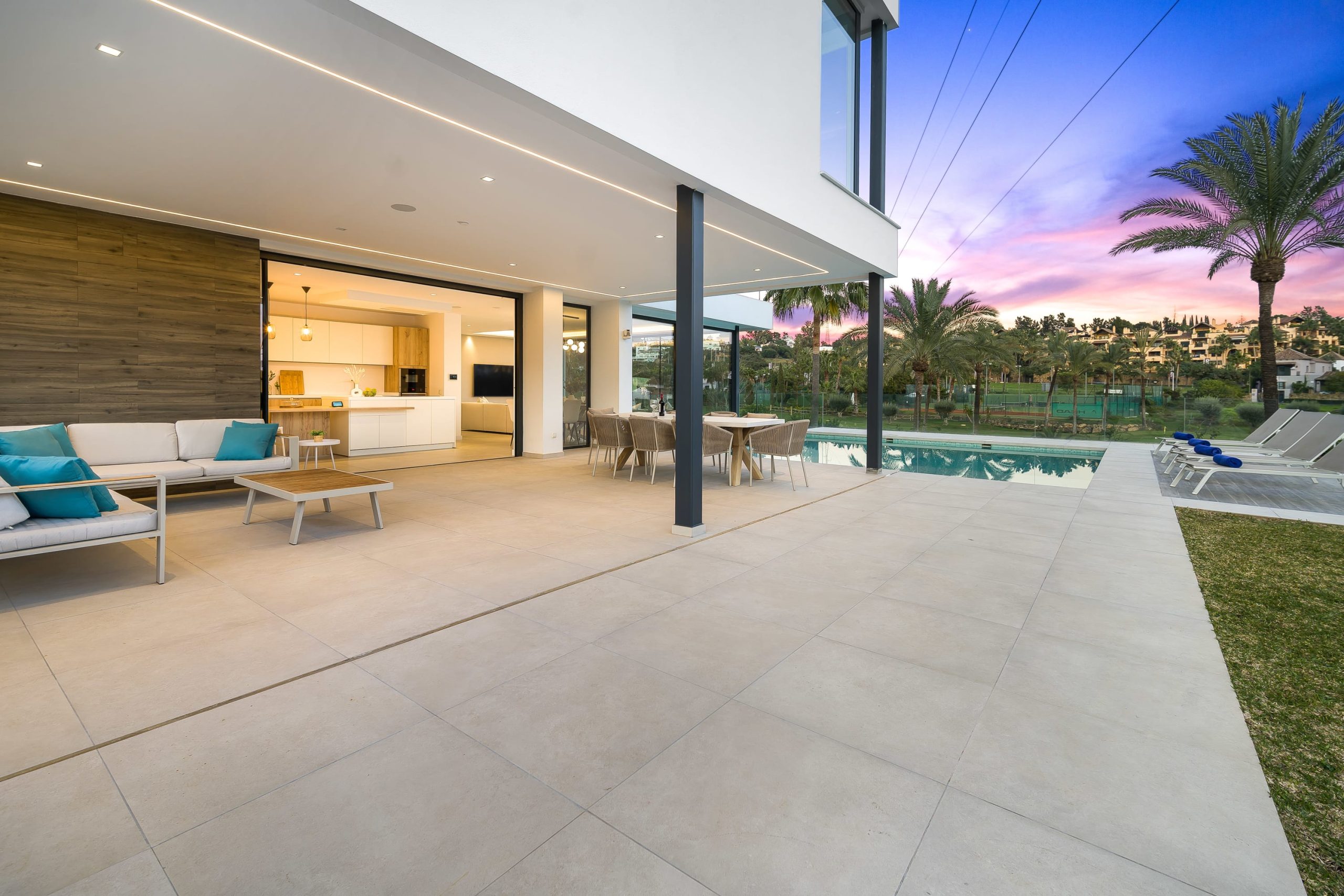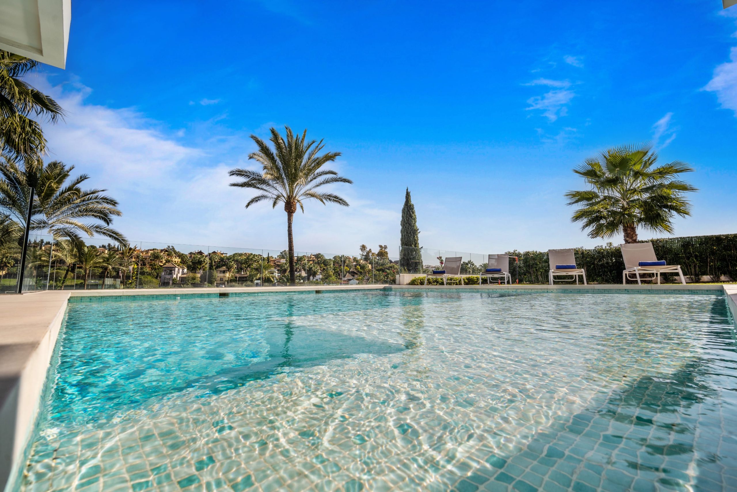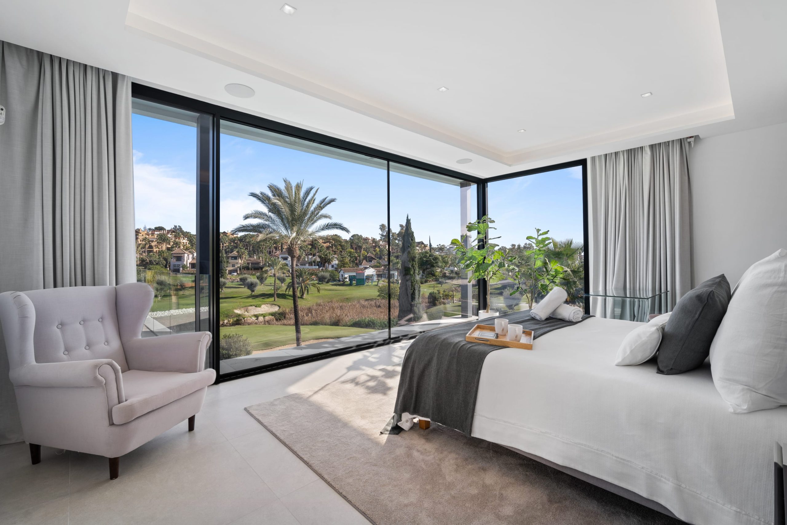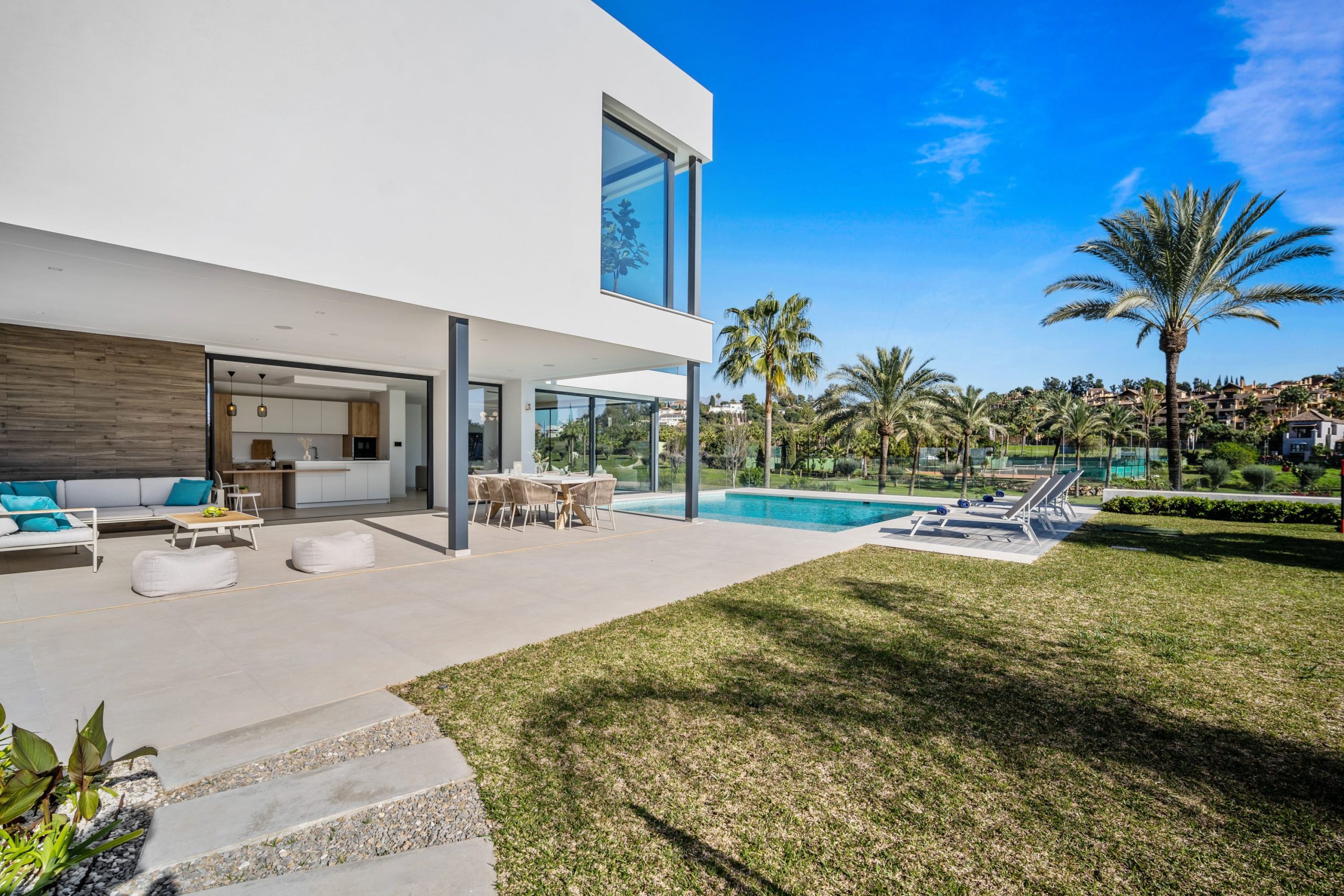 Villa Sandie is located in the tranquil setting in the heart of El Paraiso but only less than 3kms to the beach, this short-term rental is facing El Campanario Golf course and it has three other iconic golf courses: El Paraiso Golf, Atalaya Golf, and Guadalmina Golf, all within 8 minutes by car. The world famous marina of Puerto Banus is less than 10 minutes by car. The property is surrounded by the idyllic Andalusian nature and similar high-end properties.